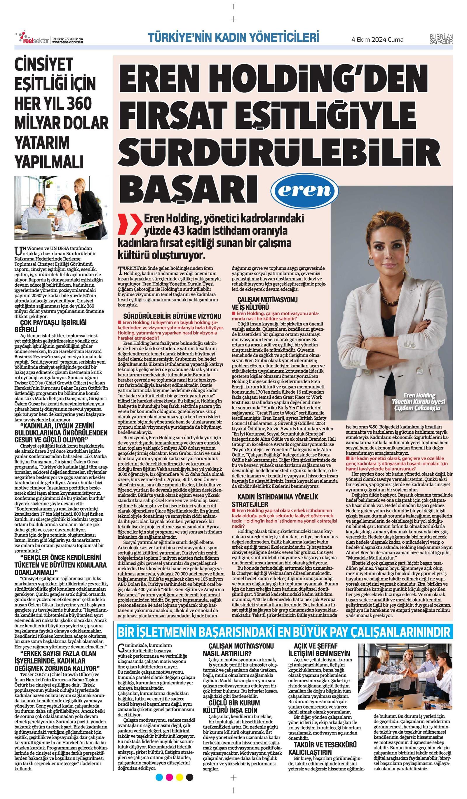 Eren Holding Yönetim Kurulu Üyemiz Çiğdem Çekceoğlu, Holding'in sürdürülebilir büyüme vizyonunun temel taşlarını ve kadınlara fırsat eşitliği sağlama konusundaki yaklaşımlarını Hürriyet ile paylaştı.